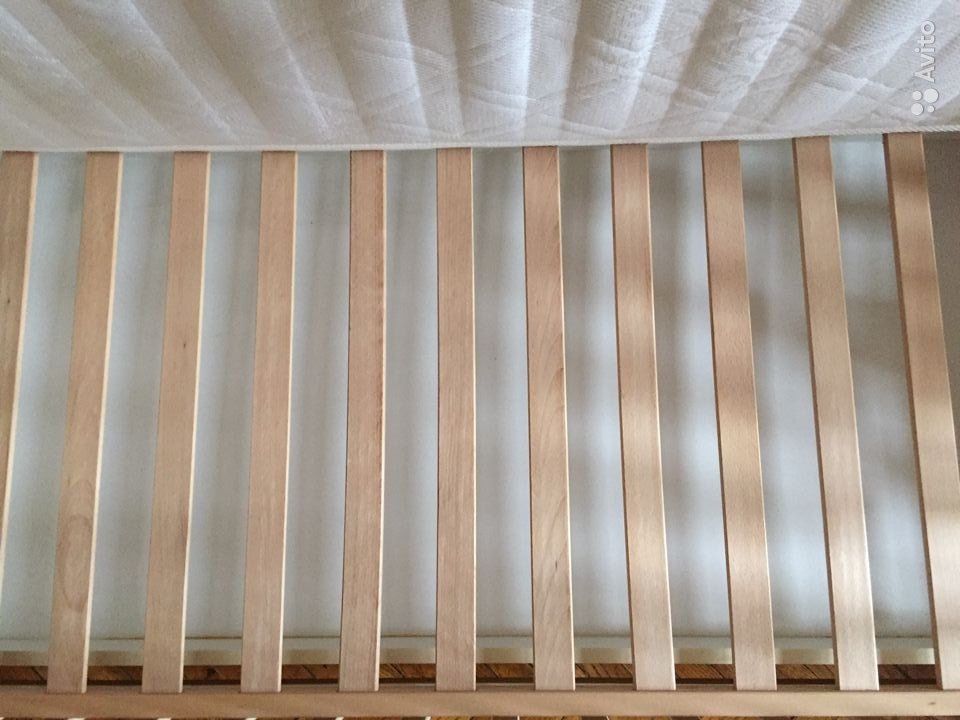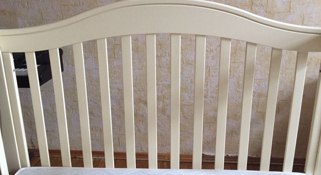 Два положения реечного дня, передний бортик снимается, превращая кроватку в софу.